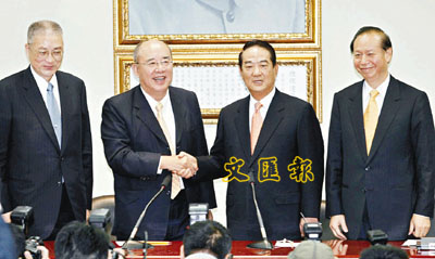 ■國民黨主席吳伯雄(左二)與親民黨主席宋楚瑜(右二)14日舉行記者會,共同宣佈兩黨合作的細節。 中央社