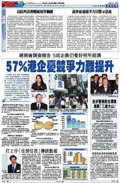 香港總商會於昨舉辦的第14屆商業高峰會上,公佈了其年度進行的「商業前景問卷調查」,結果顯示,受訪者普遍對2007年本港整體營商環境感到滿意,其中76.8%的受訪公司對今年的營商環境表示「頗為滿意」或「非常滿意」。有51.4%的受訪公司預期明年的經濟會「比今年更佳」或「遠較目前佳」。