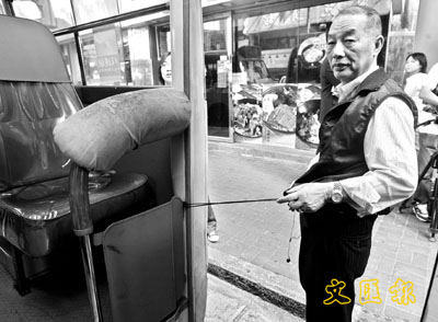 ■香港公共小巴車主司機協進總會秘書長黎銘洪昨日親自示範,小巴車門扶手位置安裝的鋁板很容易鉤著落車乘客如耳筒等物件扣帶,釀成危險。本報記者劉國權 攝