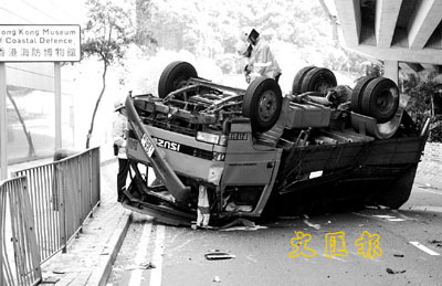 筲箕灣譚公廟道與東喜道交界昨午12時左右發生貨車與平治房車相撞意外,肇事貨車撞毀房車後,衝前逾15米剷上花槽再翻轉在路中四輪朝天,司機與一名跟車工人俱受傷送院。受意外影響,附近道路交通擠塞,約半小時後,另一輛客貨車擬在路中掉頭時,意外與鄰線一輛送外賣薄餅電單車相撞,電單車司機倒地受傷。
