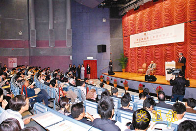 【本報訊】(記者 羅賀琪)香港中文大學昨向著名作家、資深報人查良鏞(筆名金庸)頒授文學院榮譽教授,並安排他主持一個「中國歷史的大勢」的講座,分享他對中國歷史大勢的看法。會上500個座位爆滿,座無虛席。而本港多所大學、中大東華社區書院及香港教育城網站等亦同步直播該講座,令教育界有機會一睹這位「大俠」的風采。在討論環節,不少中大生對其武俠作品大感興趣,紛紛就此提問。