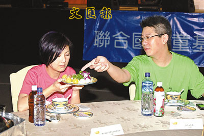 ■在聯合國兒童基金會的籌款活動上,與歌星楊千嬅同檯吃火鍋。