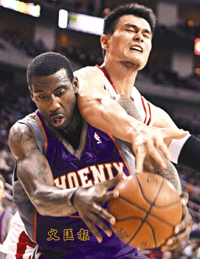 ■姚明(後)今仗遭太陽的史杜達米亞重點防守。美聯社