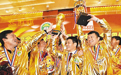 ■長春亞泰捧起中超冠軍獎盃。新華社