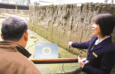 19日,成都金沙遺址博物館講解員向遊客介紹「太陽神鳥」金飾出土情況,其出土地現已成為當地的重要景點之一。「太陽神鳥」金飾是金沙遺址博物館鎮館之寶,其圖案被確定為中國文化遺產標誌。 中通社