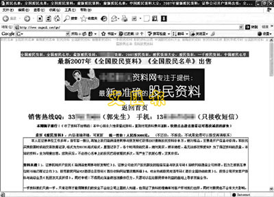 「2007年最新全國各地股民名單,市場孤品,難得的第一手資料。」包括姓名、電話、交易紀錄在內的80萬國內股民資料,被一些專門販賣個人信息的網站公開叫賣。不知情的股民被「販賣」後,將可能受到源源不斷的短信廣告、推銷電話騷擾。個人資料的外洩,令他們心生不安。
