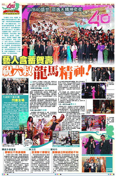 【本報訊】(記者 梁靜儀 黃佩麗) 無線電視為慶祝四十週年台慶,昨晚假將軍澳電視廣播城舉行「萬千星輝賀台慶」,今年的台慶可謂雙重意義,除了賀無線四十週年外,還有老闆邵逸夫爵士迎來百歲生日,所以當晚全台藝員傾力演出,並起用十全十美司儀陣容,計有汪明荃、鄭裕玲、曾志偉、陳百祥、丘凱敏、陳敏之、葉翠翠、崔建邦、鄧健泓及王貽興擔任,陣容十分強大。由於六叔生日一向喜歡低調,藝人祝壽時既想祝賀他生日但又不敢講明,節目期間有特別唱祝壽歌,含蓄地為向六叔祝壽!直到庾澄慶表演完才大膽講:恭喜六叔龍馬精神!TVB愈來愈勁! 祝六叔愈來愈勁!