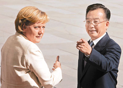 ■德國總理默克爾對中國立場轉趨強硬。圖為中國總理溫家寶去年9月訪問德國柏林。 資料圖片