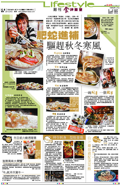 大家必然聽過「秋風起,三蛇肥」,因為一到秋冬時分,蛇就長得又肥又粗,加上蛇肉有驅寒暖胃功效,所以中國人很久以前已視之為時令進補佳品。眼見天氣愈來愈清涼,貪吃的小記就急急腳,和新晉歌手王友良一起到老字號的蛇王芬「進補」一番。