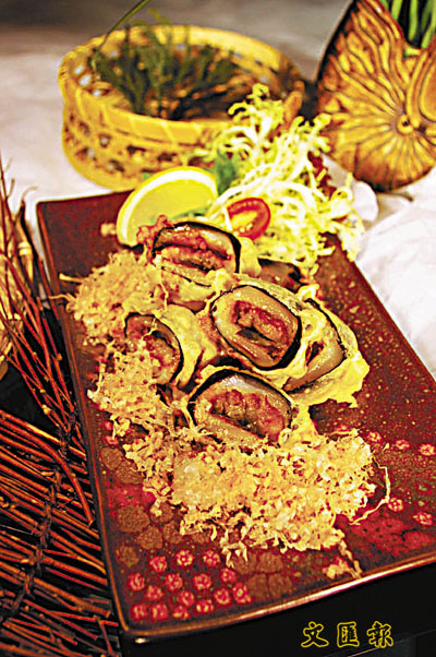 ■自創的鰻魚年糕,以日本年糕裹著蒲燒鰻魚,外面再捲以紫菜,外脆內軟。