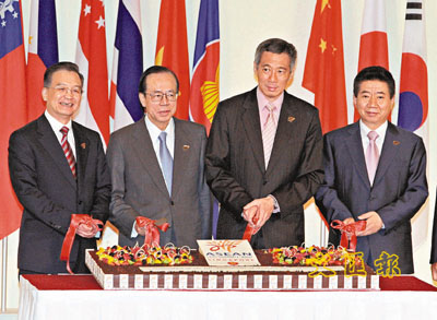 ■東盟與中日韓13國領導人今天齊聚新加坡,為紀念「10+3」合作10周年切蛋糕。左起:中國國務院總理溫家寶,日本首相福田康夫,新加坡總理李顯龍,韓國總統盧武鉉。美聯社