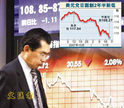 受到次按問題蔓延及房地產市場疲弱拖累,美國聯儲局調低明年經濟增長預測到1.8%至2.5%,投資者預期聯儲局或將再減息,拖累美元表現。美元兌日圓低見108.27,創2年半低位,引發日圓利差交易掀起9年來最大的拆倉潮,昨晚10時報108.61。交易商預料,美元匯價短期內未許樂觀,不排除美元會在105日圓水平始有支持,而中期目標則為100日圓水平。