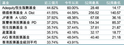 佔近三個月榜首的Adequity恆生指數基金,基金在2006年表現為35.82%,基金平均市盈率和最差季度收益為14.13倍及10.33%。