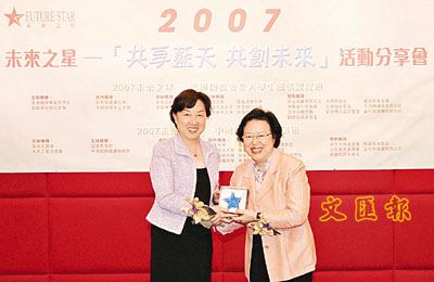 ■韓力副社長(左)向譚惠珠(右)致送紀念品。本報記者潘達文 攝