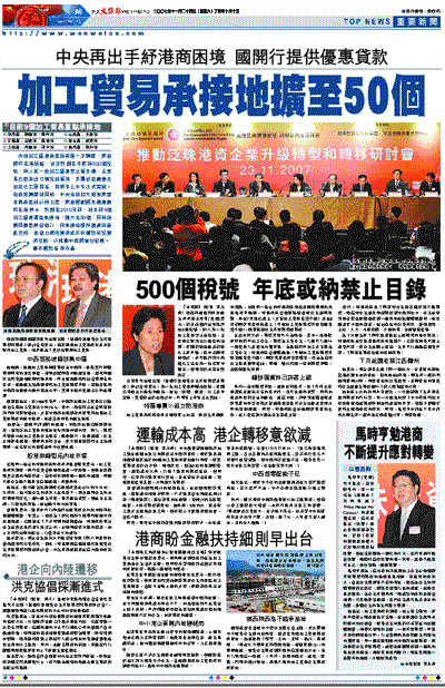 內地加工貿易政策將有進一步調整,商務部昨在港透露,初步計劃在年底將500個稅號,納入新一批加工貿易禁止類目錄,主要是已取消出口退稅的類別,多屬初級礦產及初級化工原料等,料明年上半年正式實施。但政策調整的同時,中央也將加大對港商資金與政策的扶持力度,商務部副部長魏建國昨在港表示,計劃在2010年前,將目前9個加工貿易重點承接地,擴大至50個;同時將聯同國家開發銀行,向承接地提供優惠的貸款支持,並致力減低物流成本和增設保稅物流功能,以推動中西部省份發展。