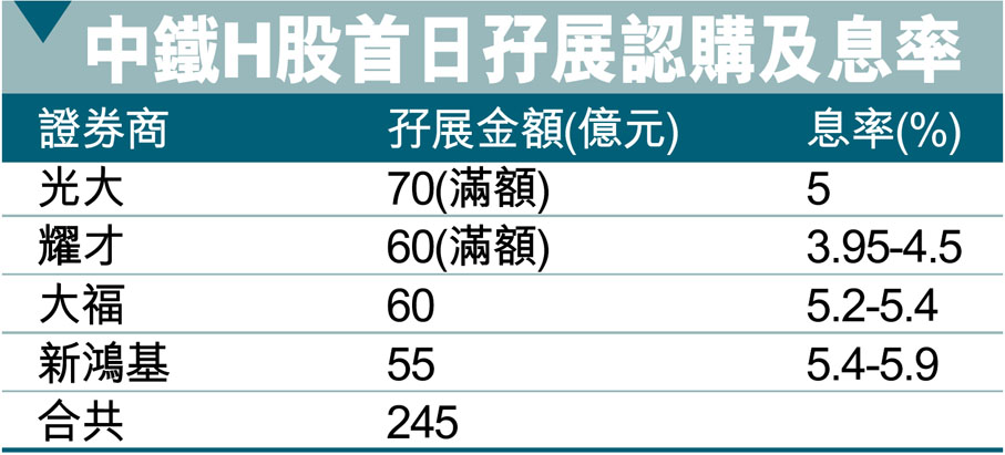 中鐵H股首日孖展認購及息率