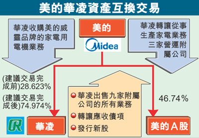 【本報訊】華凌集團(0382)昨宣佈,與美的集團的一家附屬公司簽訂有條件協議,向其收購從事家電電機業務的美的附屬公司威靈控股(BVI),同時向其出售包括於華凌九家附屬公司內的所有現有業務。於交易完成後,華凌預期將可以顯著提升其資產基礎及資本基礎。華凌將成為「威靈」品牌的白色貨品上游電機的主要生產商,並且是美的集團旗下唯一一間在香港上市的企業。