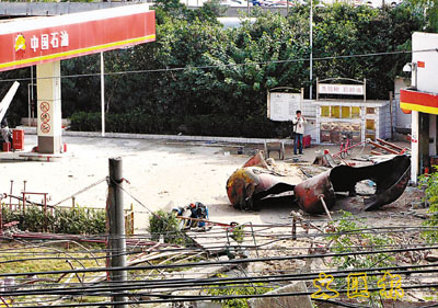 現場可以看到,事發浦三路路面都是水泥石塊,加油站附近的建築物玻璃都被砸碎,路面交通已全面受阻。爆炸產生的強烈衝擊波震碎附近許多民宅的窗戶,停靠在該站不遠處的一輛公交車車窗玻璃全部被震碎,附近的多輛汽車遭受不同程度損壞。途經此處的一輛公交車受巨大氣浪衝擊,致車內多名乘客受傷。