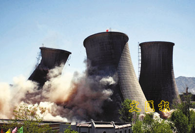 ■若節能不達標,地方官員的政績將被一票否決。圖為甘肅對高耗能、高污染的甘肅電投永昌發電公司1-5號火電機組進行拆除爆破。資料圖片