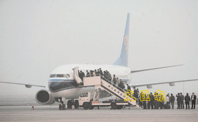 ■24日,一場大霧籠罩河南省的鄭州新鄭國際機場。圖為部分旅客在大霧中登機。法新社