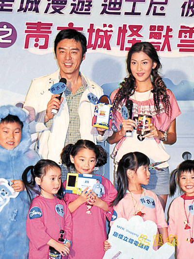 【本報訊】(記者 梁靜儀)五年前有份為迪士尼動畫《怪獸公司》配音的鍾鎮濤、森美及李彩華,昨日再次重聚齊出席「青衣城怪獸雪村」開幕禮,身穿短裙的李彩華更冒走光之險,蹲低抱起扮演動畫角色的小女孩,她的美腿更引來癡情男Fans對她大唱情歌。