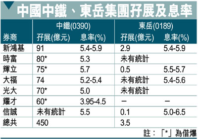 【本報訊】(記者 狄夢宇)昨中國中鐵(0390)進入招股第二日,消息指,中鐵白表派發超過100萬份,但市場資金繼續抽緊,多家券商紛紛借爆,共借出450億元孖展額,相當於獲超額認購逾22倍;而首日招股的東岳集團(0189)由於市場缺水,情況不甚理想,僅超購逾1倍。而將於明日掛牌上市的中國重汽(3808)一手中籤率為10%,11手穩中1手。