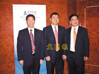 ■(左起) 安東石油執行董事兼執行副總裁馬健、主席兼行政總裁羅林、財務總監何軍昨同出席投資推介會。本報記者張以正 攝