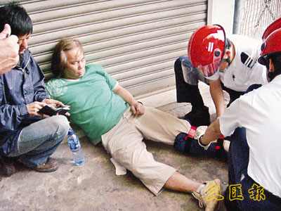 ■燒焊引起火警後,失足墮樓受傷工人即場接受救護員檢查傷勢。