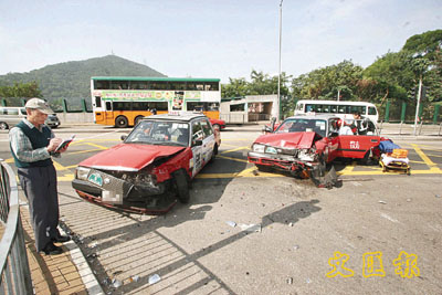 薄扶林道昨晨10時40分發生兩的士相撞車禍,一輛的士疑在越過對面行車線轉入一條小路時,因迎面而至的另一的士收掣不及撞向車身,兩車當場俱告毀爛,其中一的士司機及一名女乘客受傷,幸經送院敷治後已無大礙,車禍令往西區方向交通一度擠塞。受傷的士司機姓張、48歲,左膝及頸部痛楚,而女乘客姓鄭、35歲,頭部撞及硬物感到痛楚,事後需安排救護車送院敷治。