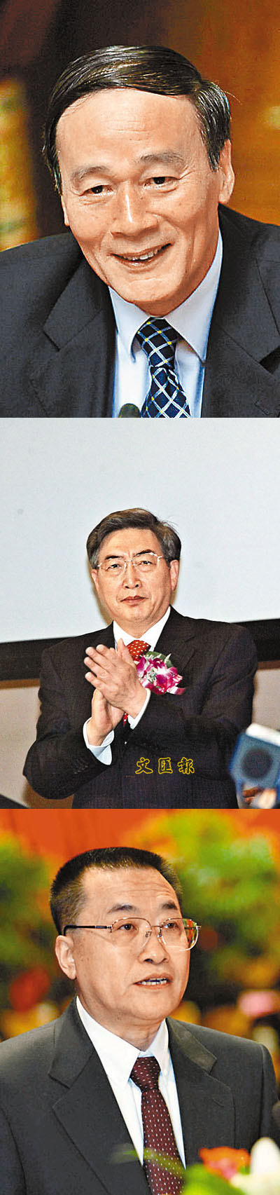 王岐山,1948年7月生,山西天鎮人,1983年2月入黨,西北大學歷史系歷史專業畢業。69年到陝西省延安縣馮莊公社當知青,大學畢業後到陝西省博物館工作。88年起,先後任中國農村信託投資公司總經理、建設銀行行長,97年任廣東省副省長,2000年到國務院經濟體制改革辦公室擔任主任,02年任海南省委書記,03年起任北京市長。