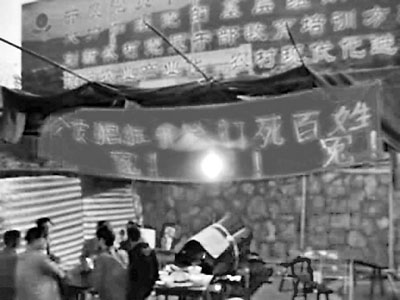 ■死者家屬將亡屍裝入棺材停於現場喊冤。本報記者 攝
