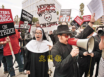 ■一班恐怖片的編劇,亦穿上戲服上街示威。 美聯社