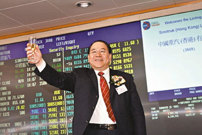 ■中國重汽昨上市,主席馬純濟出席上市儀式時表示,公司在行業內佔重要位置,亦能推動國家發展,所以對前景有信心。本報記者張偉民 攝