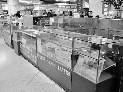 記者昨天中午在賽格電子市場發現,以往擺滿了各種電子組件的櫃台現已大部分清空,部分則用報紙遮掩櫃中產品,一些售賣翻版軟件的店舖以「員工放假」、「門面轉讓」等借口拉閘關舖。有商舖老闆表示,不久前有中央領導要到華強北視察的消息傳出,而市場也要求商戶自己自覺自查。大家都怕出事,於是眾多售商戶都忙於撤貨以應付檢查。