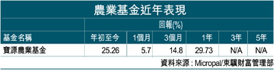 全球食物供求失衡之趨勢,加上開發替代能源衍生對農產品之需求,勢將進一步刺激農作物的價格,作為投資者,亦應該好好把握這個投資機遇。要投資於農業板塊,除了直接投資農業股外,亦可透過基金投資以分散風險,寶源農業基金是一個不錯的選擇。寶源農業基金成立於2006年10月,成立至今錄得25.26%的回報;該基金主要透過投資於全球與農業商品有關的工具以賺取回報,投資的範疇涉及殼物、油籽、人工種植類商品、禽畜、原料及纖維等,對農業板塊有興趣的投資者,可予留意。(摘錄)