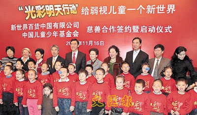 【本報訊】由中國兒童少年基金會與新世界百貨中國有限公司合作、由香港延伸至內地各大城市的「光彩明天行動—給弱視兒童一個新世界」,日前在北京人民大會堂重慶廳舉行隆重的慈善簽約儀式。