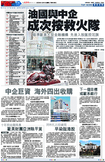 由於歐美國家在次按金融危機的衝擊下經濟續走下坡,股份及物業價格急跌,當地巨企正處於水深火熱之中。反觀處於世界的另一邊中東產油國及中國等亞洲國家,受惠於包括商品石油價格大漲,及經濟股市全速起飛,兩地投資者賺到盤滿缽滿。這兩路資金軍團,近日已瞄準歐美市場,紛紛趁機以低價收購歐美一些因經營虧損而難以為繼的歐美巨企,相繼入股匯控及花旗等次按輸家。中東產油國以至於中國投資者已搖身一變成次按救火隊,市場預料這兩路救火軍團下一站將全力進攻歐洲市場。