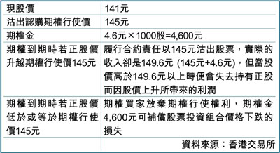 若投資者現持有一手1,000 股甲股票。甲股票的市價為141元,投資者若短期內看淡股價,但長期則看好,而並不會考慮賣出股票,在這種情形下,投資者可以考慮沽出認購期權,賺取期權金。 例如投資者以每股4.6元 沽出一張(即1,000股)甲股票即月145元的認購期權合約, 可獲得4,600元期權金。若投資者的預計正確,甲股票的價格在到期日並未上升至145元以上,期權買家將不會行使權利向投資者買入甲股票,已收取期權金4,600元將變為投資者的利潤。不過,其中風險將會是若股價上升至145元或更高,期權買家便會要求投資者履行責任以行使價賣出甲股票,但由於投資者已收到每股4.6元的期權金,故實際的每股收入會是149.6元(145元+4.6元)。所以,只有當股價在到期時高於149.6元時,這種策略才會較不採取任何行動為差。