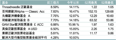 近三個月榜首的Threadneedle 泛歐基金,基金在2004、2005和2006年表現分別為14.09%、8.27%及32.96%,基金平均市盈率、最差季度收益和標準差為14.68倍、7.36%及11.01。地區分布為61.53% 已發展歐洲及35.17% 英國。行業比重為22.24% 金融服務、20.87% 工業用品、14.08% 消費用品、11.01%消費服務、8.36% 能源、7.56% 健康護理、4.79% 商業服務、2.94% 電訊、2.33% 電腦硬件及0.5% 電腦軟件。