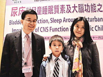 ■經過醫學院教授楊重光(左)的治療後,及早解決了陳梓杰的尿床問題,令陳太(右)放下心頭大石。本報記者羅敬文 攝