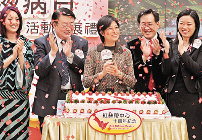 為響應今天世界愛滋病日,昨日多間機構舉辦「2007世界愛滋病日活動開展禮」。行政長官夫人曾鮑笑薇(中)、食物及衛生局局長周一嶽(左四)、衛生署署長林秉恩(左二)均有出席。本報記者李志樑 攝
