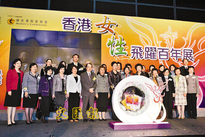 【本報訊】(記者 潘曉平)「香港女性飛躍百年展」於11月30日至12月3日假灣仔會展舊翼展出。日前,主辦機構婦女事務委員會主席高靜芝、勞工及福利局局長張建宗陪同行政長官曾蔭權夫人曾鮑笑薇、全國婦聯副主席劉海榮、中聯辦副主任郭莉、外交部駐港特派員呂新華夫人張靜婭一同為展覽主持隆重開幕儀式。