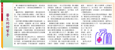 護士就更是醫生的左右手。醫生醫病,很多時靠護士執行;如果護士知道醫生為什麼給這些藥及份量,做這些手術前而醫生不在時,護士可向病人解釋清楚,令他們釋去很多疑慮。