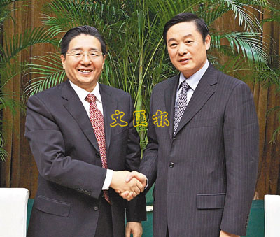 ■劉奇葆(右)與郭聲琨握手告別。中通社