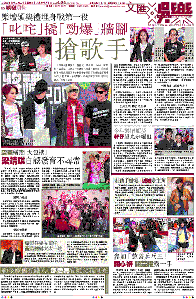 【本報訊】陳奕迅、容祖兒、楊千嬅、Twins、張敬軒、古巨基、王菀之、何韻詩、林峰、鄭希怡、泳兒等歌手昨日出席葵芳新都會廣場舉行的「新城勁爆頒獎禮2007」記者會,場面熱鬧。但許多歌手匆匆「閃走」趕去「叱吒」綵排。