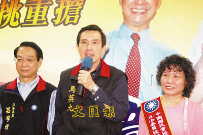 ■3日,馬英九到新竹,為競選連任的立委呂學樟(左)站台時,質疑228事件究責條例草案是否符合民進黨「總統」參選人謝長廷的和解主張。 中央社
