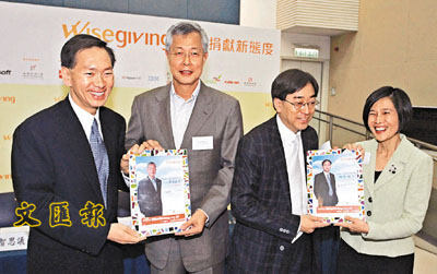 ■前警務處長李明逵(左二)和香港防癌會主席高永文(右二)獲社聯委任「WiseGiving計劃」的慈善大使,推廣捐獻文化,社聯主席陳智思(左一)昨向二人贈送紀念品。本報記者高仲明 攝