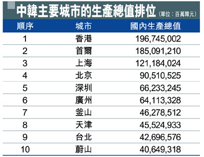 經濟指標——「城市生產力」排行中,香港和首爾居前兩位。但在經濟增長率方面,所有韓國城市均排在第44位之後,令人切身體會到中國城市的高速發展速度。