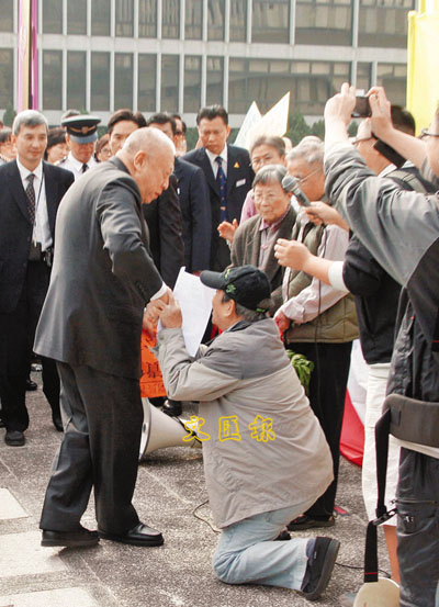 ■董建華(左)於典禮後親自會見長者聆聽訴求,有人激動得向他下跪。本報記者曾慶威 攝