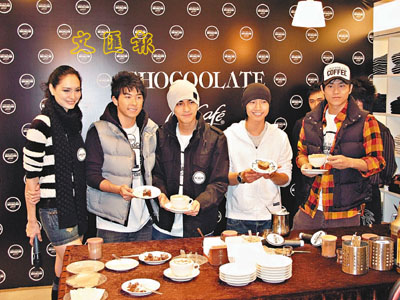【本報訊】(記者 李慶全)時裝品牌CHOCOLATE於旺角專門店昨日開幕,關楚耀、陳柏宇、林威辰、森美及名模Ana R.出席開幕禮,四位年輕偶像分兩組,即場比賽沖朱古力咖啡,美女Ana R.則充當評判,可惜各人都笨手笨腳,森美在咖啡加上大量糖漿,不堪入目,但Ana R.竟愛甜味咖啡,森美與陳柏宇最後也勝出。